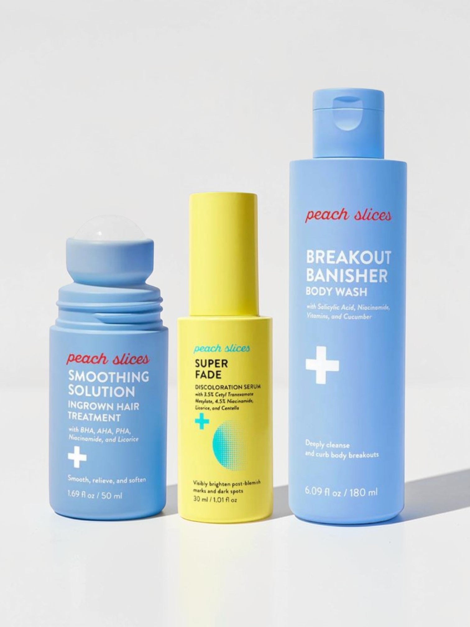 Start with the body wash to cleanse the skin, apply the ingrown hair treatment to areas prone to bumps, and use the discoloration serum to help improve uneven skin tone.